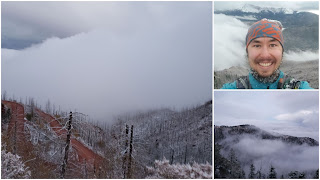This was the fun one! A true adventure run, one that required a little bit of uphill scrambling and some bushwacking. I encountered snow, cold, wind, thick fog, and amazing views.